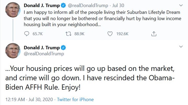 **編者按:**美國大選已進入百日倒計時,競選兩派明爭暗鬥愈發激烈,任何領域都可以挖掘競選議題並加以操作。在美國,有個當下很多中國人難以理解的現象,被稱為“窮人住城市,富人住郊區”。7月30日,共和黨領袖、美國總統特朗普發佈推文,大談美國的“郊區生活夢想”(Suburban Lifestyle Dream),炫耀自己廢除了奧巴馬-拜登時期破壞這一“夢想”的住房政策。