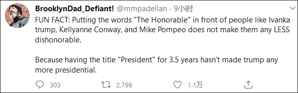 還有人則藉機對整個特朗普政府展開了批評:“有趣的事實是:把‘尊敬的’頭銜放在伊萬卡、蓬佩奧和康威的名字前,也不會讓他們顯得不光彩。畢竟特朗普頂着總統的頭銜有三年半了,也沒見他變得哪裏像個總統。”