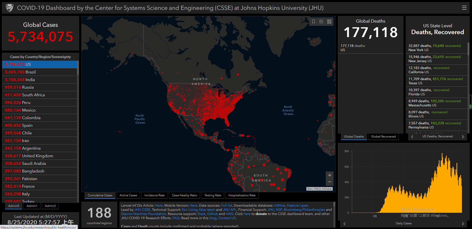 (觀察者網訊)根據美國約翰斯·霍普金斯大學實時數據,截至北京時間8月25日5時27分(美東時間8月24日17時27分),過去的24小時,美國新增新冠肺炎確診病40196例,新增死亡病例459例。累計確診病例5734075例,累計死亡病例177118例。