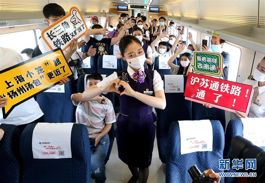 C3836次列車乘務員在車廂內為旅客表演節目(7月1日攝)。7月1日,滬蘇通鐵路開通運營,上海至南通最快旅行時間壓縮至1小時6分鐘。新華社記者 陳飛 攝