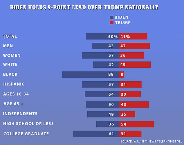 在2016年8月底,民主黨民調如日中天,遠遠把特朗普甩在後面。《紐約時報》在8月初曾經形容特朗普競選團隊分崩離析。2016年8月的《華爾街日報》和全國廣播公司(NBC)民調顯示特朗普落後9個百分點。有趣的是,在2020年8月23日公佈的《華爾街日報》和全國廣播公司民調顯示,特朗普仍舊落後9個百分點。