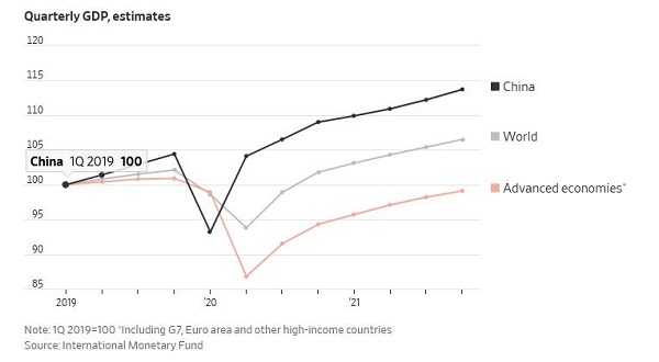 這種反彈雖然遠遠比不上中國過去幾年令人興奮的經濟擴張,但它仍有助於這個世界第二大經濟體更快的趕上美國,美國經濟在2020年可能萎縮高達8.0%。