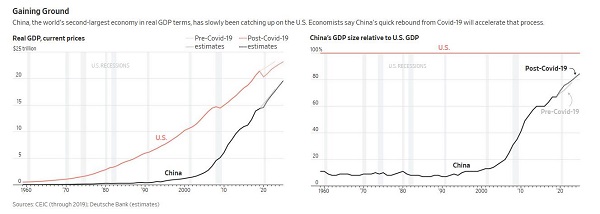 在疫情爆發之前,德意志銀行(Deutsche Bank)估計,中國經濟規模在2019至2023年間將增長約26%,而同期美國經濟規模將增長8.5%。