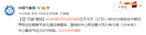 中國氣象局官方微博8月27日消息,今年第8號颱風巴威已於當天8時30分前後在中朝交界附近的朝鮮平安北道沿海登陸,登陸時中心附近最大風力有12級(35米/秒),中心最低氣壓為970百帕。