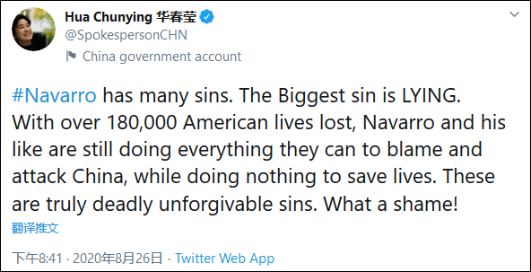 當晚,華春瑩先是在個人推特上寫道:“納瓦羅犯下許多罪過,最大的罪過莫過於謊話連篇。在美國已有超過18萬人因疫情而死亡之時,納瓦羅等人不但不採取任何行動挽救生命,反而仍不斷指責和攻擊中國,這些都是不可饒恕的致命罪過,真可恥!”