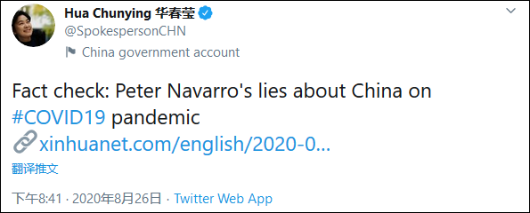 8月26日晚間,中國外交部發言人華春瑩連發兩條推特,對納瓦羅在疫情問題上攻擊和指責中國的謊言進行了駁斥,並列出了具體例證加以證明。