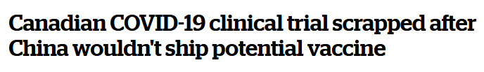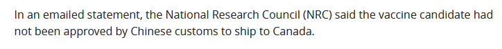 《環球郵報》稱,加拿大國家研究委員會在一份電子郵件聲明中表示,該候選疫苗未經中國海關批准運往加拿大。