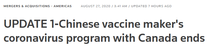 (觀察者網訊)當地時間8月26日,路透社、加拿大《環球郵報》先後報道説,加拿大國家研究委員會(NRC)當天(26日)表示,已終止與中國企業康希諾生物在研發新冠病毒疫苗方面的合作,稱後者目前無權運送疫苗。