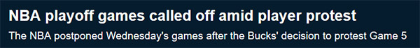 布萊克的遭遇也引起了NBA球員的罷賽抗議。根據NBA官網消息,來自威斯康星州的雄鹿隊已經正式發表聲明,支持球員的罷賽主張,隨後湖人、開拓者等球隊也先後選擇罷賽,預定的三場比賽將被迫延期。在弗洛伊德後,NBA球員在賽前奏美國國歌時會單膝跪地以示抗議,這一做法曾招致特朗普的批評。