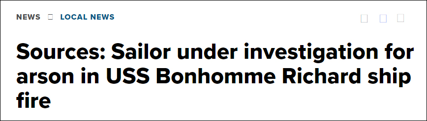 美國廣播公司(ABC)電視網的聖迭戈分支“新聞10頻道”(KGTV10)26日援引多名消息人士稱,美國海軍犯罪調查局(NSIC)認為“好人理查德”號可能被人為縱火,正對一名水兵展開調查,並數次搜查了其住所與房產。
