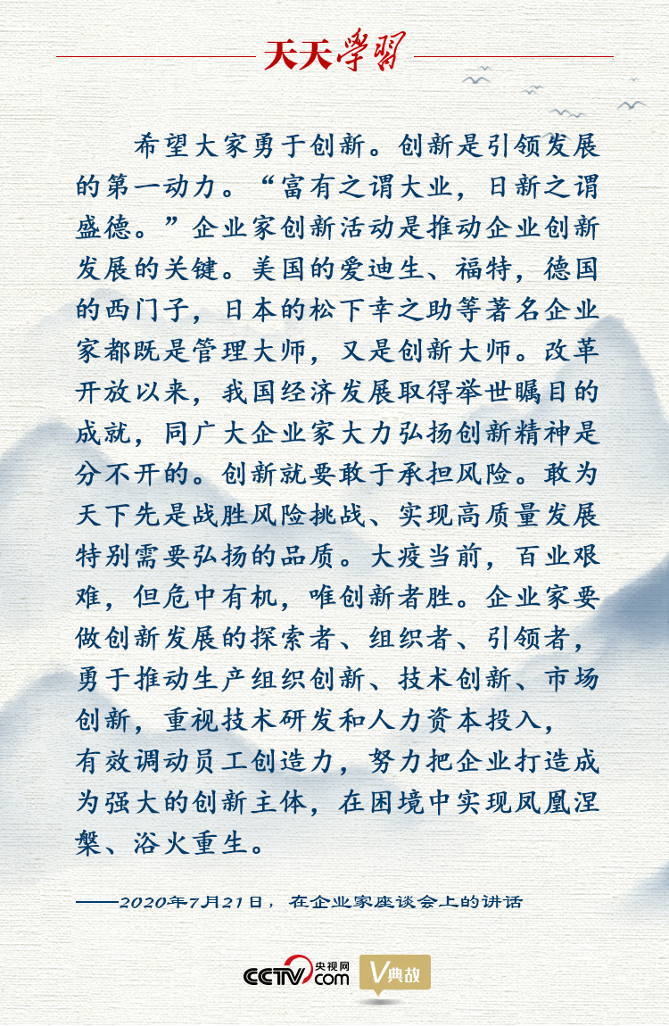 在講話當中,總書記多次談到“創新”一詞。而創新,也正是國民經濟賴以不斷發展的內生動力。上個月,總書記在主持召開企業家座談會時也特別強調了創新對於企業發展的關鍵作用,並引用了一則典故來闡釋創新的重要性。他説——