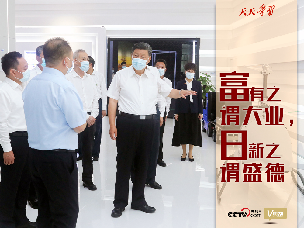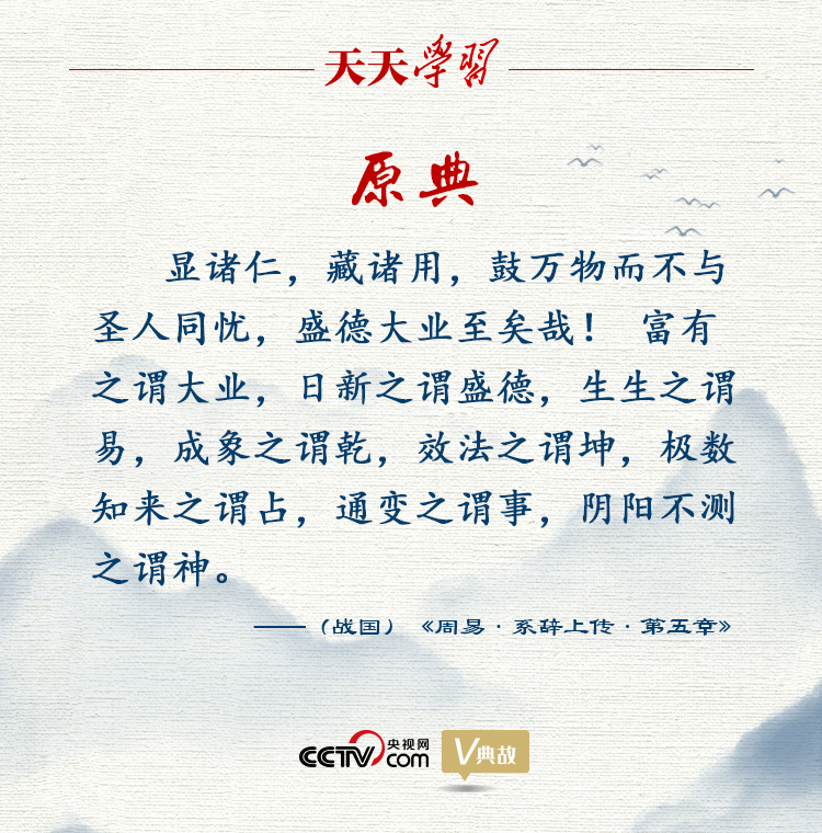 上述講話中引用的“富有之謂大業,日新之謂盛德”出自《周易·繫辭上傳》,意思是:廣泛創造物質財富和精神財富叫做弘大功業,持續永遠的日日增新叫做盛美德行。