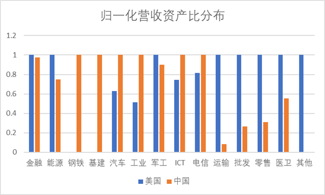 醫衞方面有製藥和醫保的因素,中美並不完全可比。在批發方面,中化實際上還有自己的煉油、倉儲,資產底數較大。中糧有大量輕紡工業,廈門建發還有房地產,資產底數都較大,實際上劃入批發也不盡合理,但在統計中,總是要歸類的,但與美國的“純批發”就不可比了。在零售方面,阿里巴巴的業務早就超過電商,所以資產底數很大。另有香港的長江和記的大量店面資產和港口推高資產底數,所以與美國的零售板塊也不可比。