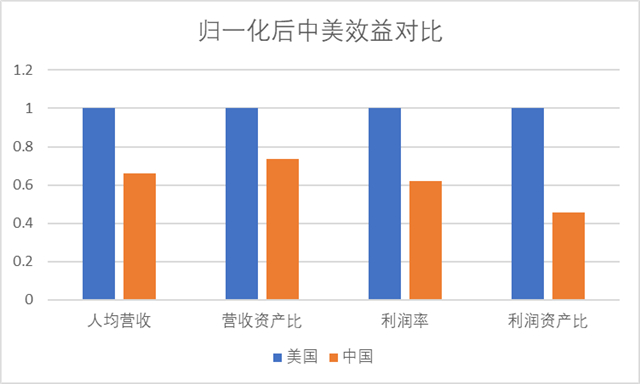 進一步分析,可以將營收、利潤、資產、就業做多向比較。人均營收代表勞動生產率;利潤率為利潤與營收之比(也可表示為利潤佔營收的百分比,兩者的意思是一樣的,只是表述不同),代表公司的自主持續發展能力;營收資產比代表資產的利用率,反映了技術水平和管理水平。比較中美,差距就顯示出來了。