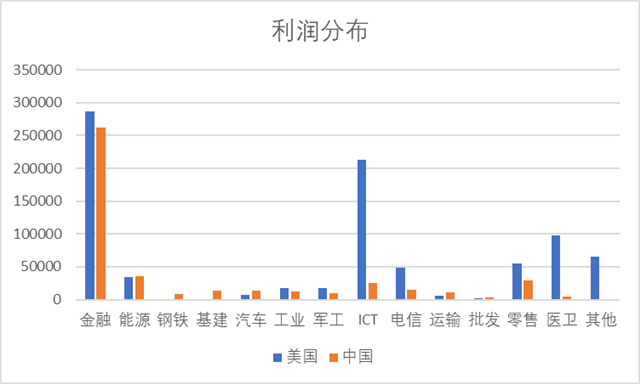 從利潤分佈看,更容易理解產業優化的重要性了。中美的金融利潤總量實際上相當接近,這是因為中國金融裏包括了房地產巨頭(如萬科、碧桂園、綠地、恒大等)。但美國ICT板塊的利潤是中國望塵莫及的,這也是美國極力打壓中國的重要原因:一旦中國在ICT方面與美國等量齊觀了,就成脱繮烈馬了,不管從科技實力到經濟體量,都將對美國是強力擠壓,加上金融實力,將從根本上動搖美國的霸權基礎。
