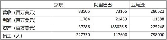 京東和阿里的營收加起來才不到亞馬遜的一半。阿里的利潤特別高,但資產也特別高;京東的營收更高,但員工更多;亞馬遜則什麼都高,唯獨利潤只有阿里的一半。亞馬遜有自己的物流和遞送,所以用工特別多。在中國,物流和遞送大多被順豐、圓通等包乾了。