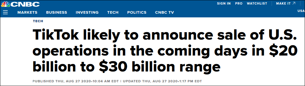 CNBC報道稱,據消息人士透露,TikTok的業務出售協議,很有可能在未來幾天內就達成,但收購方仍未確定是哪一方。CNBC的另一篇報道文章中則提到了更為具體的時間期限,稱交易將會在48小時之內達成。