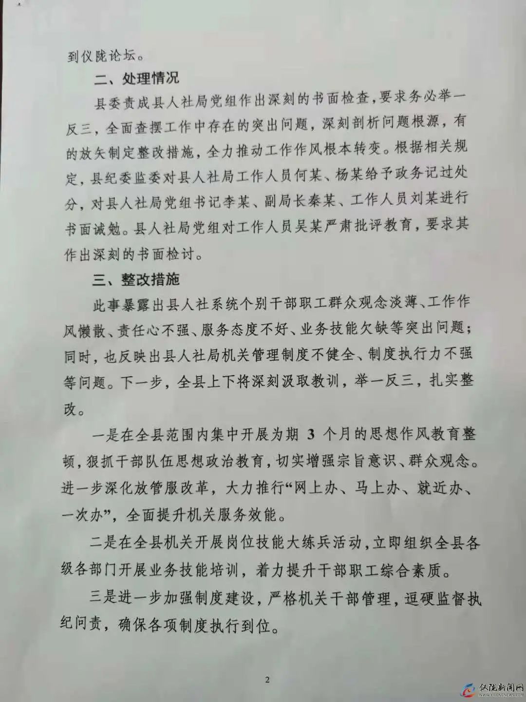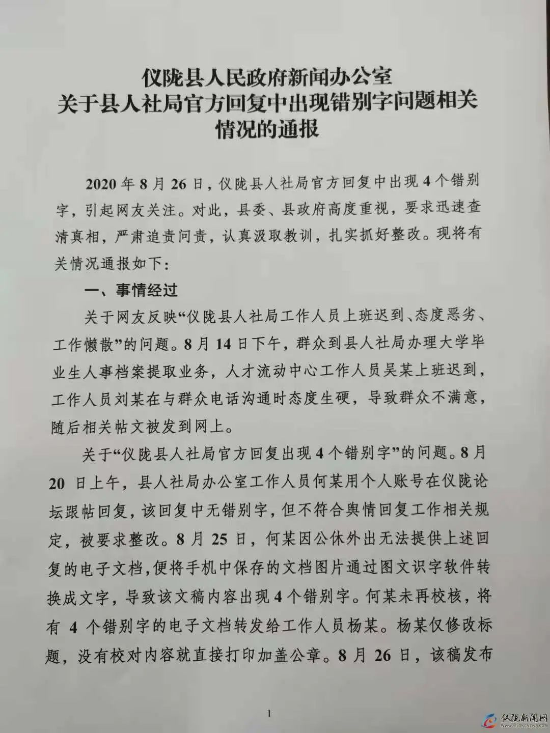 關於“儀隴縣人社局官方回覆出現4個錯別字”的問題。8月20日上午,縣人社局辦公室工作人員何某用個人賬號在儀隴論壇跟帖回覆,該回復中無錯別字,但不符合輿情回覆工作相關規定,被要求整改。8月25日,何某因公休外出無法提供上述回覆的電子文檔,便將手機中保存的文檔圖片通過圖文識字軟件轉換成文字,導致該文稿內容出現4個錯別字。何某未再校核,將有4個錯別字的電子文檔轉發給工作人員楊某。楊某僅修改標題,沒有校對內容就直接打印加蓋公章。8月26日,該稿發佈到儀隴論壇。