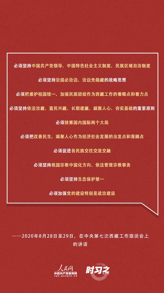 面對西藏工作面臨的形勢和任務的深刻變化,習近平在中央第七次座談會上強調:“新時代黨的治藏方略是做好西藏工作的根本遵循,必須長期堅持、全面落實。”對此,習近平提出了10個“必須”——
