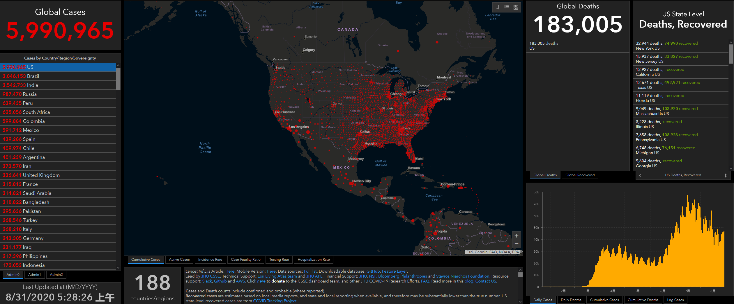 (觀察者網訊)根據美國約翰斯·霍普金斯大學實時數據網站消息,截至北京時間8月31日5時28分(美東時間8月30日17時28分),美國累計新冠確診病例達到5990965例,累計死亡183005例。從北京時間8月30日6時28分至8月31日5時28分,在過去23小時裏,美國新增32479例確診病例,新增死亡病例294例。