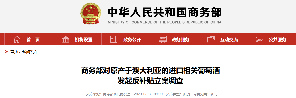 商務部網站31日消息,8月31日,商務部發布2020年第35號公告,決定即日起對原產於澳大利亞的進口裝入2升及以下容器的葡萄酒進行反補貼調查。該產品英文名稱:Wines in containers holding 2 liters or less,歸在《中華人民共和國進出口税則》:22042100。本次調查通常應在2021年8月31日前結束調查,特殊情況下可延長至2022年2月28日。
