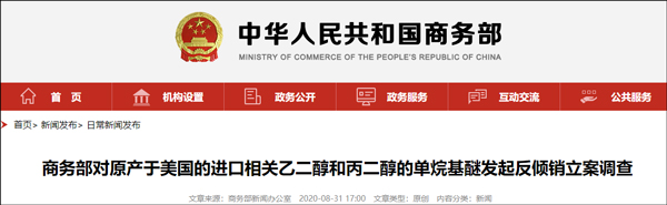 商務部對原產於美國的進口相關乙二醇和丙二醇的單烷基醚發起反傾銷立案調查