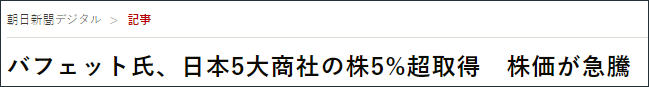 據美國消費者新聞與商業頻道(CNBC)30日報道,巴菲特的伯克希爾·哈撒韋公司已分別購入日本的5大商社略微超過5%的股份,分別為伊藤忠商事、丸紅、三菱商事、三井物產和住友商事。伯克希爾在聲明中稱,該司於過去的一年內陸續從東京證券交易所(TSE)購入上述公司股票。