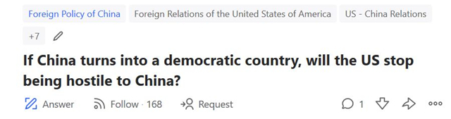 【美國政府近日來不斷出台打壓中國的敵對政策,反華力度頗有漸強之勢。而一個近年來一直在Quora(外網的“知乎”)上被討論的話題,也因為美國政府近來頻出的反華政策而重回焦點:“如果中國改成了西式民主,美國就消除對中國的敵意了嗎?”