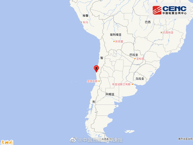 中國地震台網正式測定:09月06日09時16分在智利(南緯30.33度,西經71.52度)發生6.2級地震,震源深度10千米。