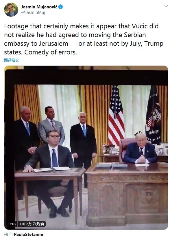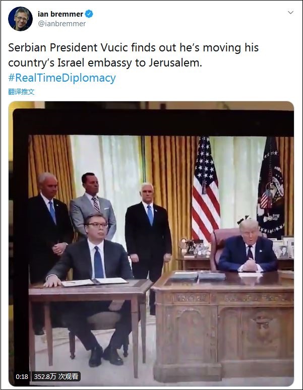 全球最大政治風險諮詢公司歐亞集團(Eurasia Group)總裁伊安·布雷默(Ian Bremmer)在推特上放出了這一視頻片段,配文寫道:“塞爾維亞總統武契奇發現,他要把駐以色列大使館搬遷至耶路撒冷。”