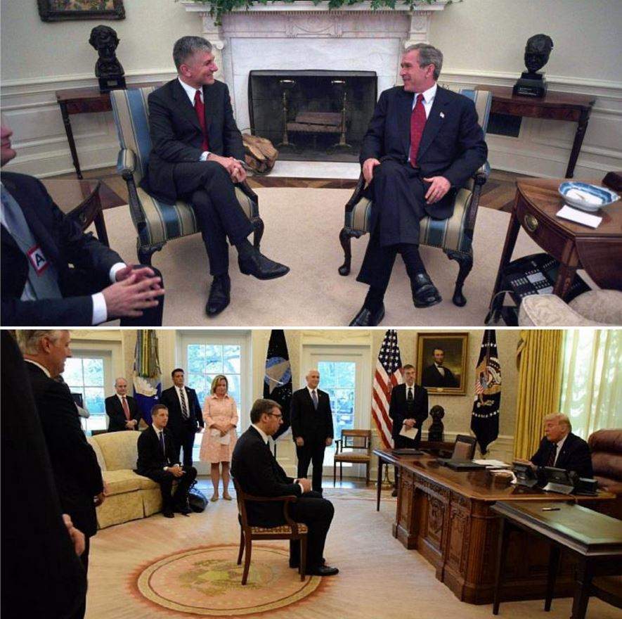 這一幕發生後,推特上還流傳着另一張照片。畫面中,武契奇在橢圓形辦公室中,正坐在特朗普的面前。推特上有不少用户把這一幕和時任塞爾維亞總理佐蘭·金吉奇(Zoran Djindjic)與時任美國總統小布什會面時的場景進行對比,批評武契奇“失去尊嚴”。