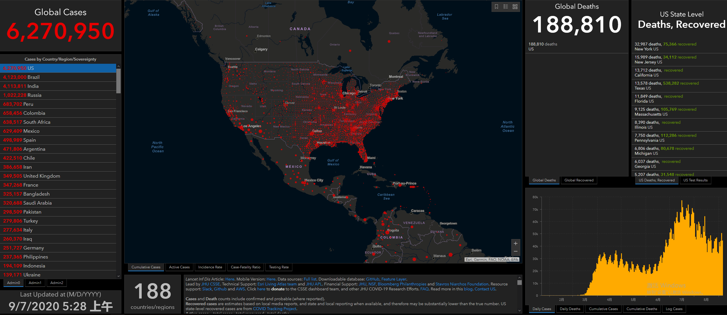 (觀察者網訊)根據美國約翰斯·霍普金斯大學網站實時數據,截至北京時間9月7日上午5時28分(美東時間9月6日17時28分),在過去23小時裏,美國累計新冠確診病例達到6270950例,新增29767例;累計死亡達188810例,新增309例。