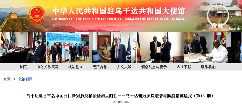 中國駐烏干達使館網站9月6日發佈《烏干達近日三名中國公民新冠肺炎核酸檢測呈陽性——烏干達新冠肺炎疫情與防疫措施通報》。