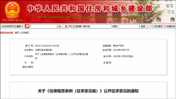 住建部網站消息,住建部9月7日發佈通知,就《住房租賃條例(徵求意見稿)》向社會公開徵求意見。
