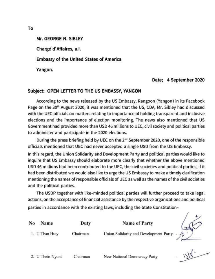 緬甸25家政黨聯合發表公開信,質疑美國所宣稱的大選援助資金去向