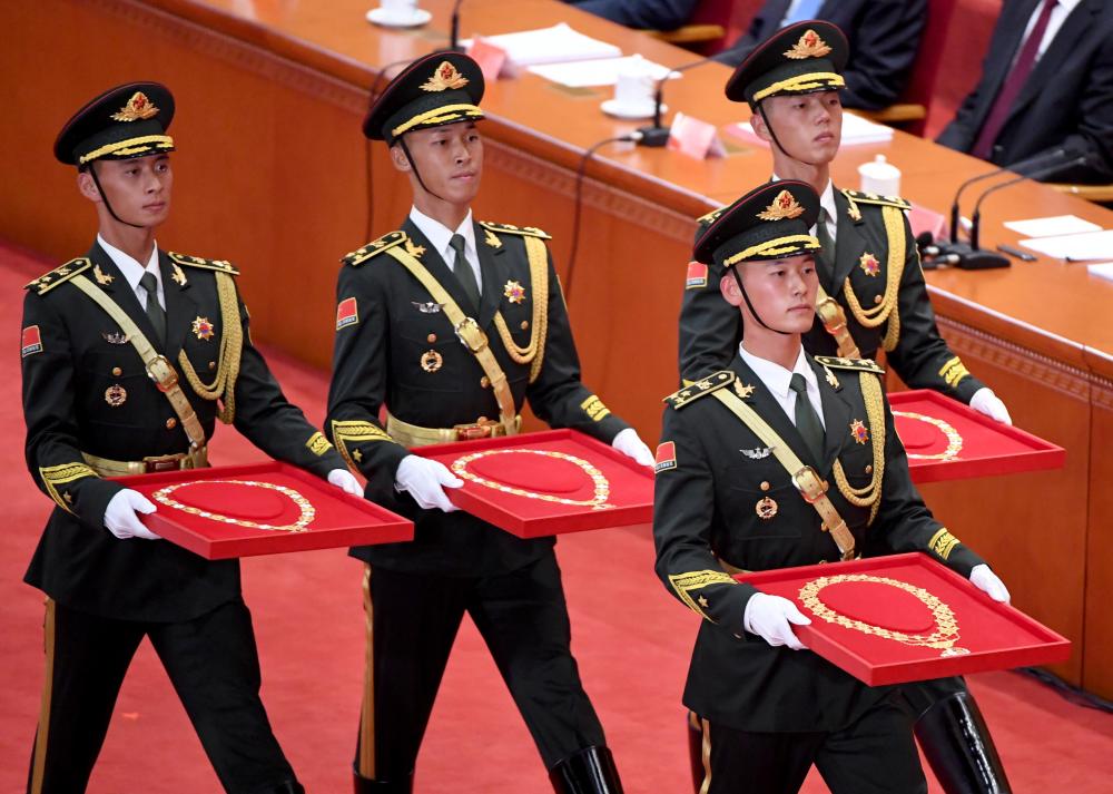 9月8日上午,全國抗擊新冠肺炎疫情表彰大會上,4名禮兵手捧共和國勳章、國家榮譽稱號獎章,行進到儀式現場。新華社記者 嶽月偉 攝