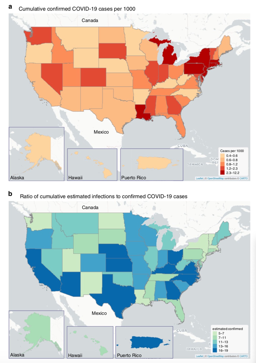 研究團隊還發現,如果按照確診病例數或估算的感染人數計算,COVID-19的發病率在美國東北部、中西部和路易斯安那州最高。低估病例數的情況在波多黎各、加利福尼亞和南部一些州更為普遍。在33個州,估算的感染人數至少是確診病例數的10倍。