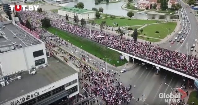 9月7日,十餘萬抗議者走上白俄羅斯首都明斯克街頭 視頻截圖