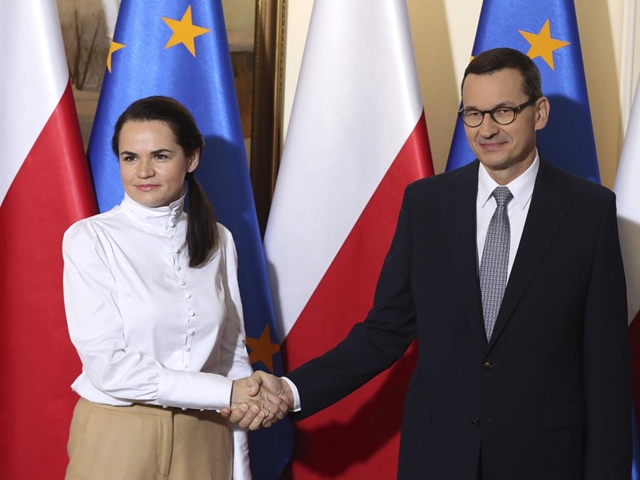 9月9日,波蘭總理莫拉維茨基與白俄羅斯反對派領袖季漢諾夫斯卡婭在華沙會面 圖自美聯社