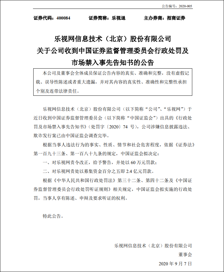此前在9月7日,樂視網公告稱,樂視網信息技術(北京)股份有限公司於近日收到中國證券監督管理委員會(以下簡稱“中國證監會”)出具的《行政處 罰及市場禁入事先告知書》(處罰字〔2020〕74 號),公司涉嫌信息披露違法、 欺詐發行案已由中國證監會調查完畢。