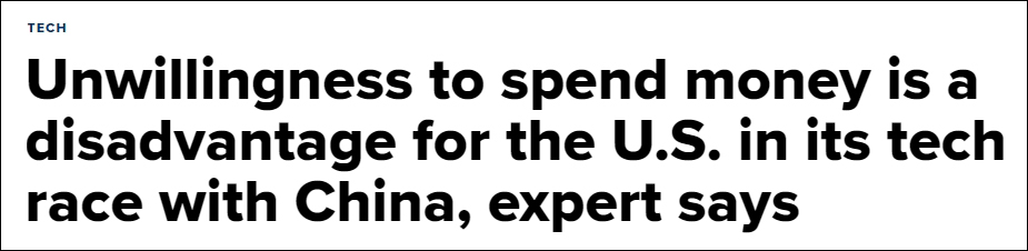 作為網絡安全與科技領域的專家,曾在美國國務院、商務部任職的劉易斯認為,美國目前在中美科技競賽中領先,但最大的劣勢是“不願花錢”。