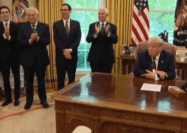 當天,美國總統特朗普在白宮橢圓形辦公室親自宣佈這一消息後,“活久見”的一幕出現了:只見他身旁的一眾官員集體瘋狂鼓掌,以至於現場記者根本無法提問。