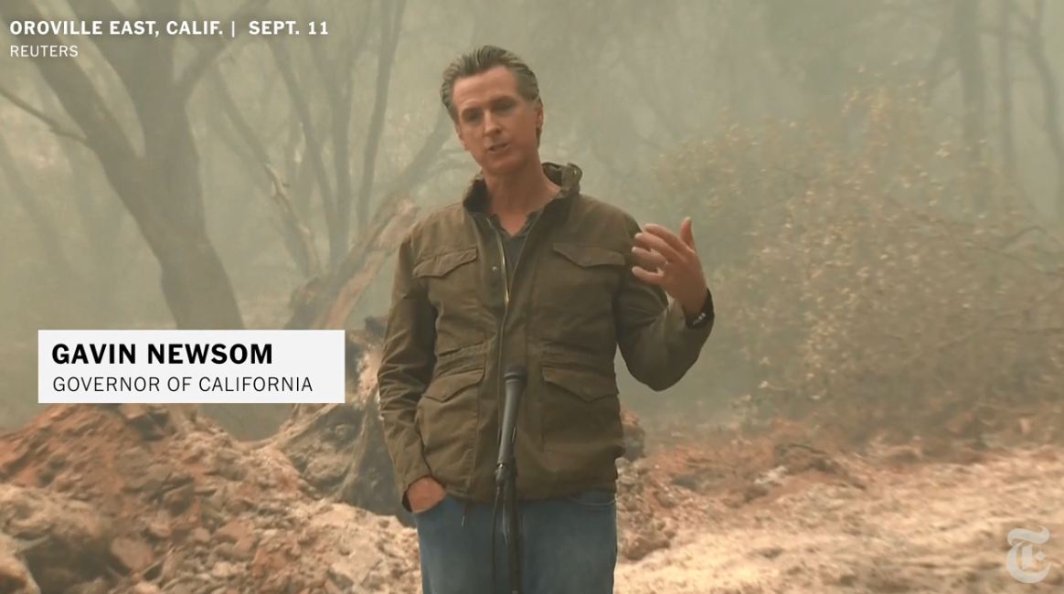 9月11日,紐森站在大火濃煙中講話 視頻截圖