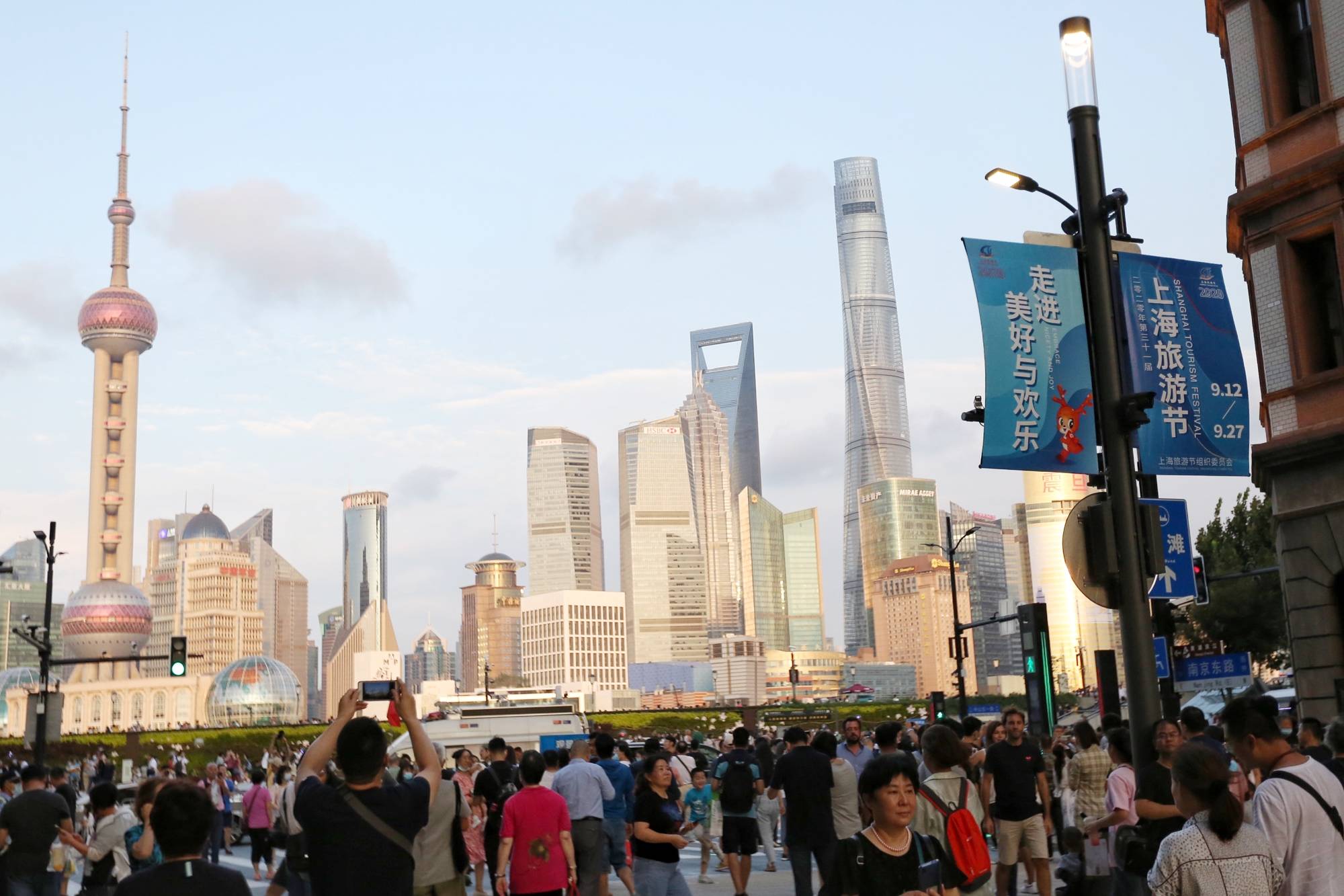 市民遊客走向東拓段外灘方向,黃浦江對岸的陸家嘴建築羣豁然開朗出現在眼前。