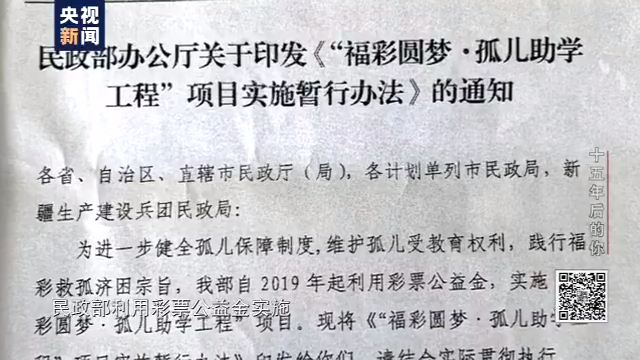 2019年7月,民政部辦公廳下發文件,自2019年起民政部利用彩票公益金,實施“福彩圓夢*孤兒助學工程”項目,只要是孤兒考上大學、大專等各類學校,每人每學年能夠得到1萬元助學金。