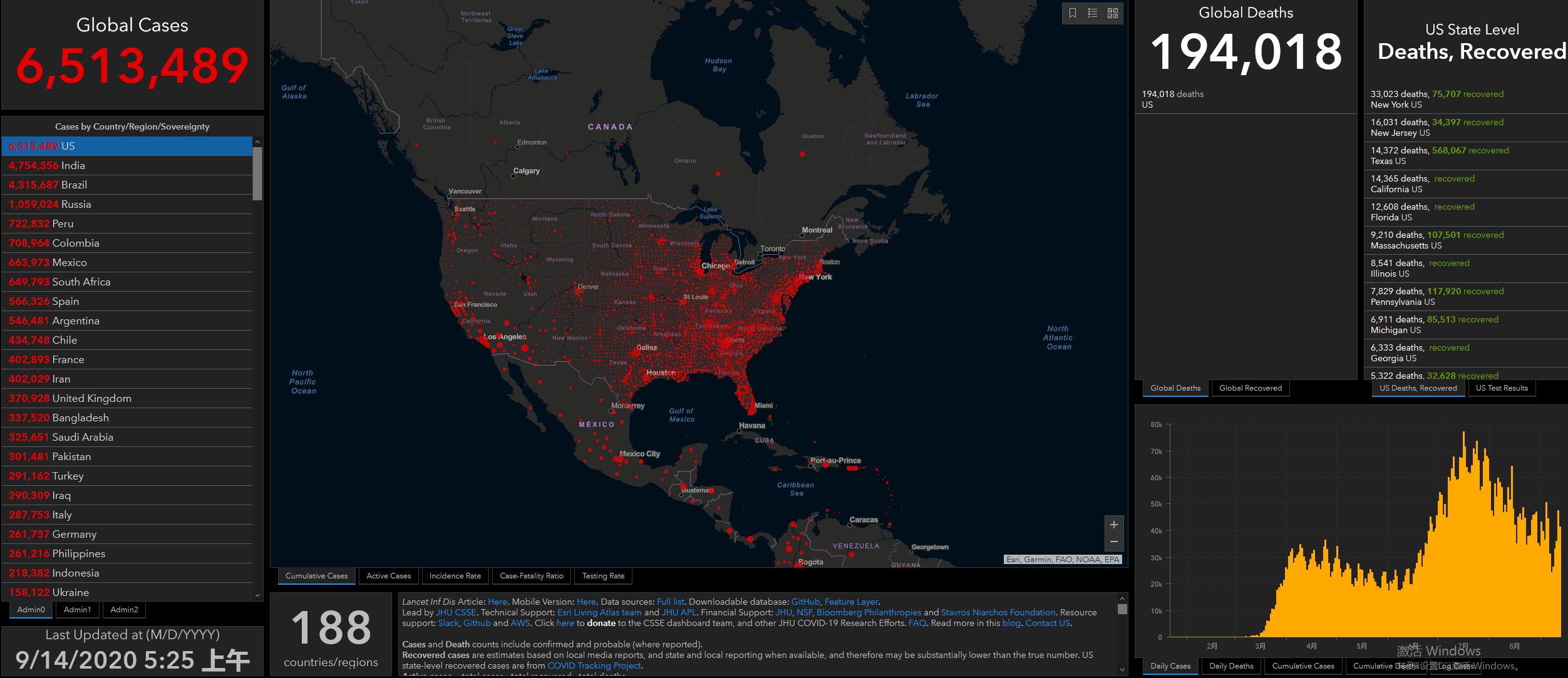 (觀察者網訊)根據美國約翰斯·霍普金斯大學9月14日實時數據,截至9月14日5時25分(美東時間9月13日17時25分),美國累計新冠確診病例達到6513489例,累計死亡達194018例,在過去23小時,新增確診病例35266例,新增死亡病例493例。