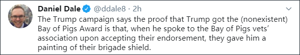 隨後,戴爾再次“反擊”。他轉發特朗普競選團隊的推文稱,“當時特朗普接受了豬灣老兵協會的資助,並發表演講,他們給了特朗普一個突擊旅徽章。”