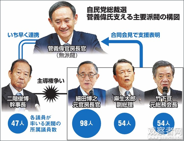 另外,菅義偉此次獲勝,依舊沒有跳出派系“窠臼”,反而仰仗黨內5大派系的支持,得以提前鎖定“勝局”。雖然菅義偉7日公開表示“不會回應派閥的期望”,但在他的背後,支持他的派閥之間對黨內主導權的爭奪,仍“暗流湧動”。