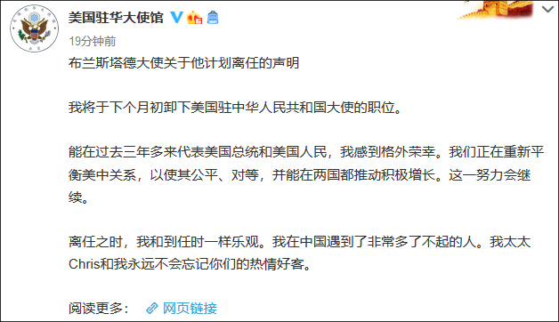 隨後,@美國駐華大使館 官方微博發佈布蘭斯塔德計劃離任的聲明: