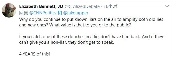 “你們為什麼繼續讓一個有名的騙子上電視,來放大那些新舊謊言?這對你或公眾有什麼價值?如果你發現其中一人在説謊,就別讓他再回來了。如果他們不能給你一個誠實的人,那就別讓他們説話了。整整4年了!”